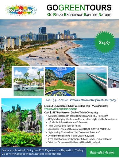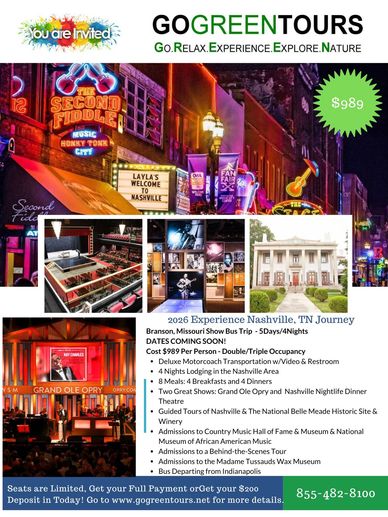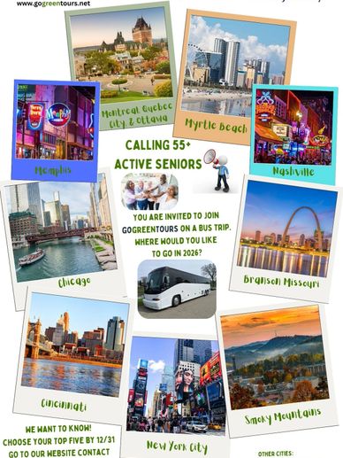 Calling All Active Seniors. You are Invited to journey with GOGREENTOURS on some awesome get-a-ways. 2026 we are now serving Indianapolis Senior Communities. We want your imput on where you would like to go? Send us your top 5 Picks at our contact page, or call us at 855-482-8100.